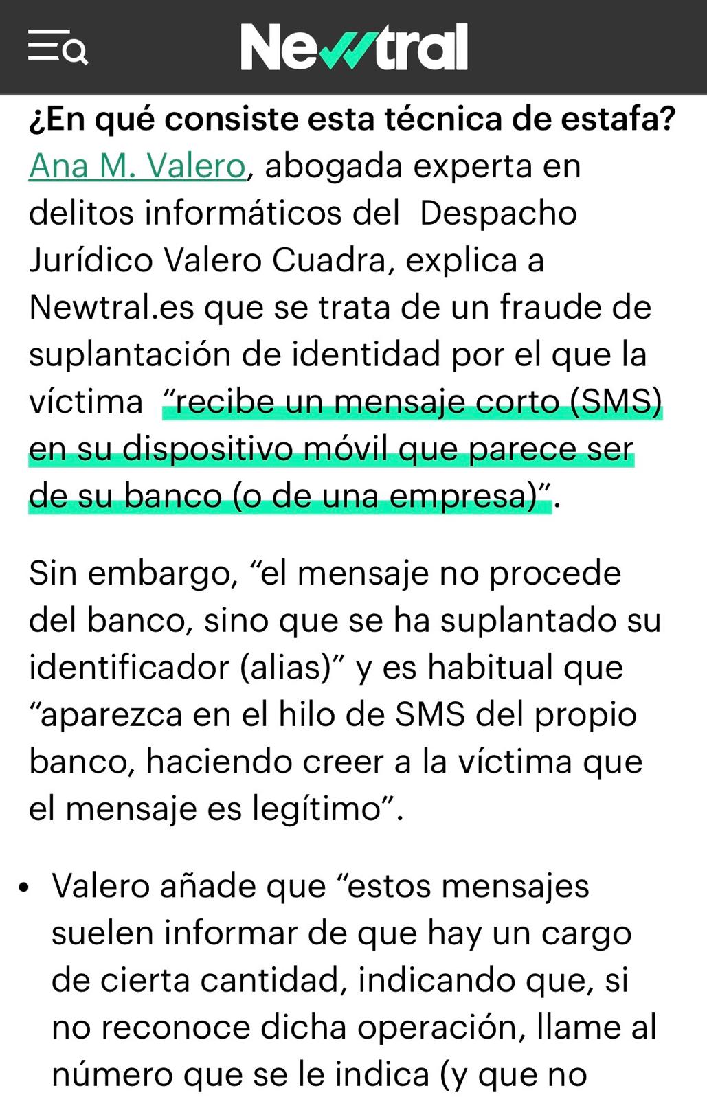 En un reportaje publicado en Newtral, Ana M. Valero, abogada especialista en delitos informáticos, intervino para explicar en qué consiste el denominado SMS spoofing, una técnica de fraude que permite a los ciberdelincuentes suplantar la identidad de entidades legítimas mediante el envío de mensajes de texto que aparentan proceder de fuentes fiables, como entidades bancarias u organismos públicos.