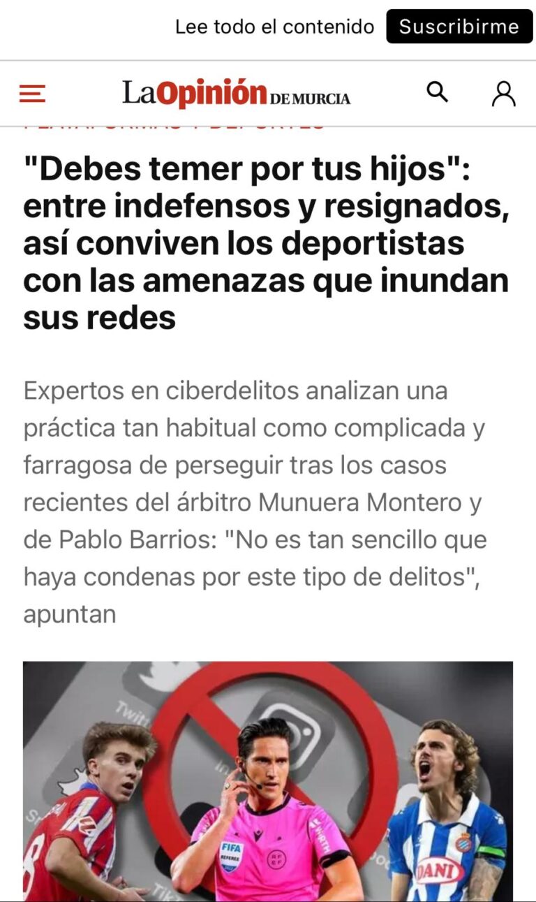 Ana M. Valero en La Opinión de Murcia explicando las dificultades jurídicas del acoso digital a futbolistas